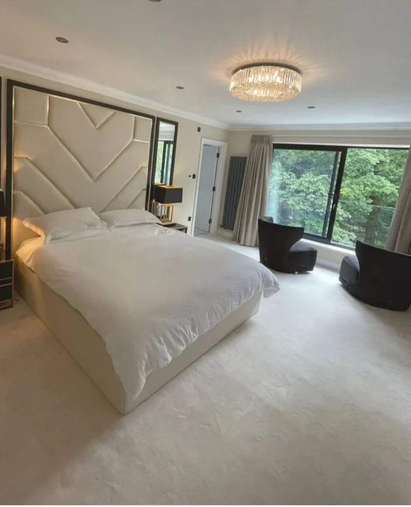Layered geometric upholstered wall panels installed behind a bed in a modern bedroom.