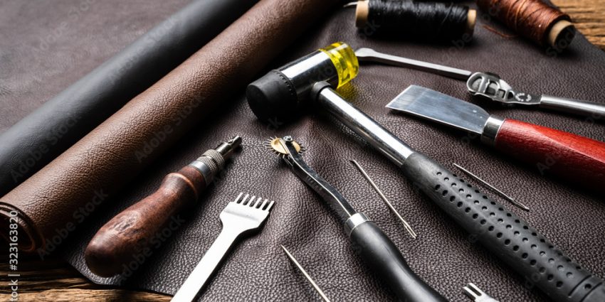 Assorted leatherworking tools, including a mallet, rotary cutter, chisels, awl, knife, thread spools, and rolled leather arranged on a dark surface.