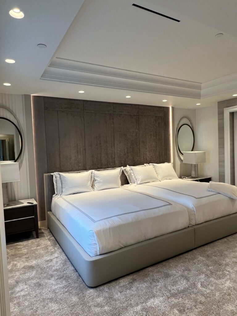 Yes. We specialize in hotel‑style headboard walls, full‑wall installations, and floor‑to‑ceiling upholstered systems. These can include integrated lighting, outlets, or millwork depending on your design.