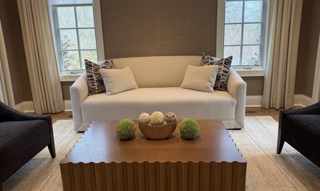 Lightcolored sofa with patterned pillows in a modern living room, centered around a wooden coffee table with decorative accents.